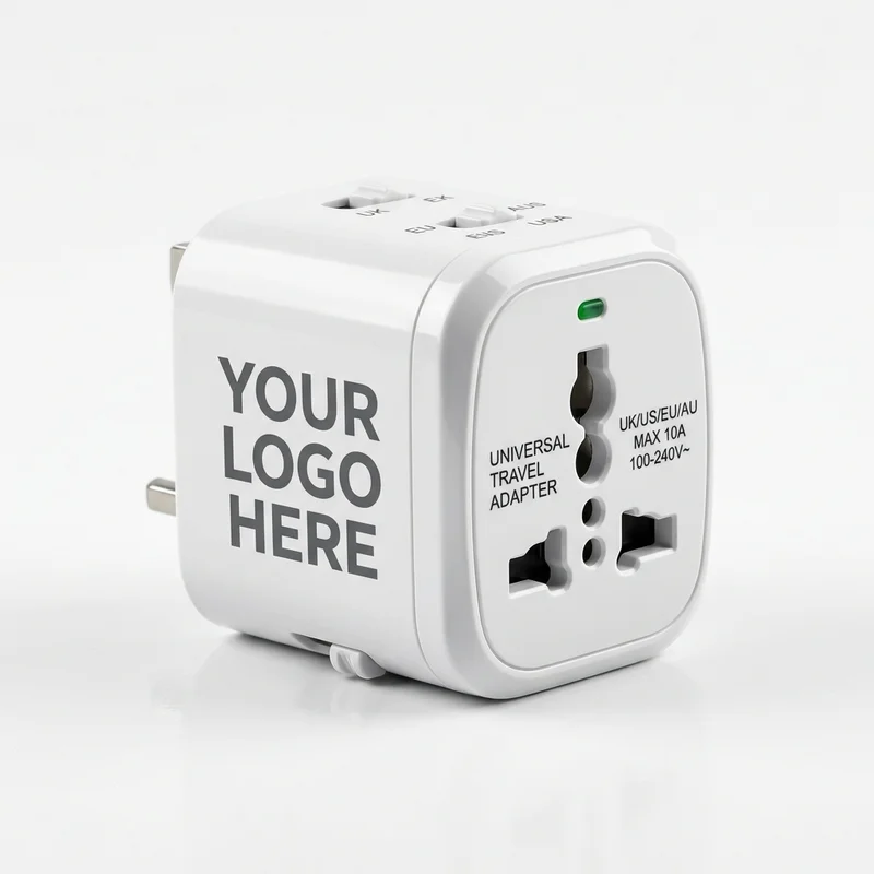 The essential companion for global travel. This universal world adapter features a compact white design and a large area for your custom brand logo.