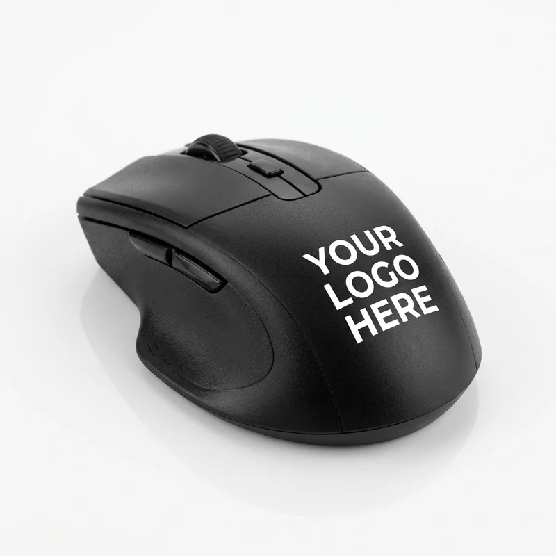 Reibungslose Navigation für Ihren Arbeitsplatz. Diese erstklassige ergonomische drahtlose optische Maus verfügt über ein elegantes schwarzes Finish und eine große Fläche für Ihr individuelles Markenlogo.