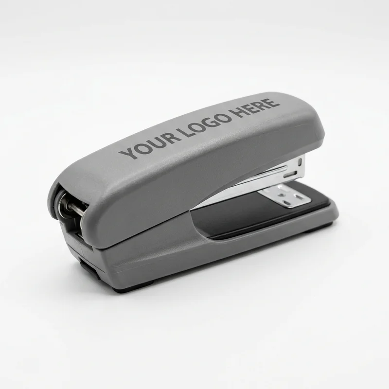 Reliable and modern. This matte gray desktop stapler features a compact design and durable construction, perfect for daily office use and custom logos.
