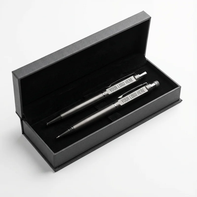 Enhance your corporate gifting with this Pen & Pencil Gift Set. Crafted from durable metal, this sophisticated set includes a sleek pen and a matching pencil, both neatly presented in an elegant gift box. At $12.00 each, this set is a practical choice for bulk orders, with a minimum quantity of 50. Ideal for client giveaways, employee recognition, or promotional events, the gift set can be customized with your logo for added brand visibility. Standard production time is 10-14 days.
