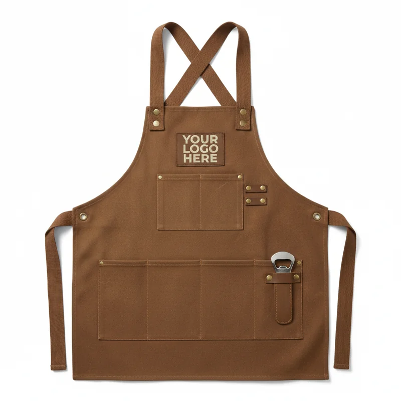 Heavy-duty BBQ apron with multiple pockets and bottle opener. Durable canvas construction stands up to grilling duties. Adjustable neck strap and waist ties fit all sizes. Front pockets for utensils and seasoning. Built-in bottle opener on strap. Perfect for restaurants, BBQ competitions, and corporate summer events. Embroider or screen print logos.