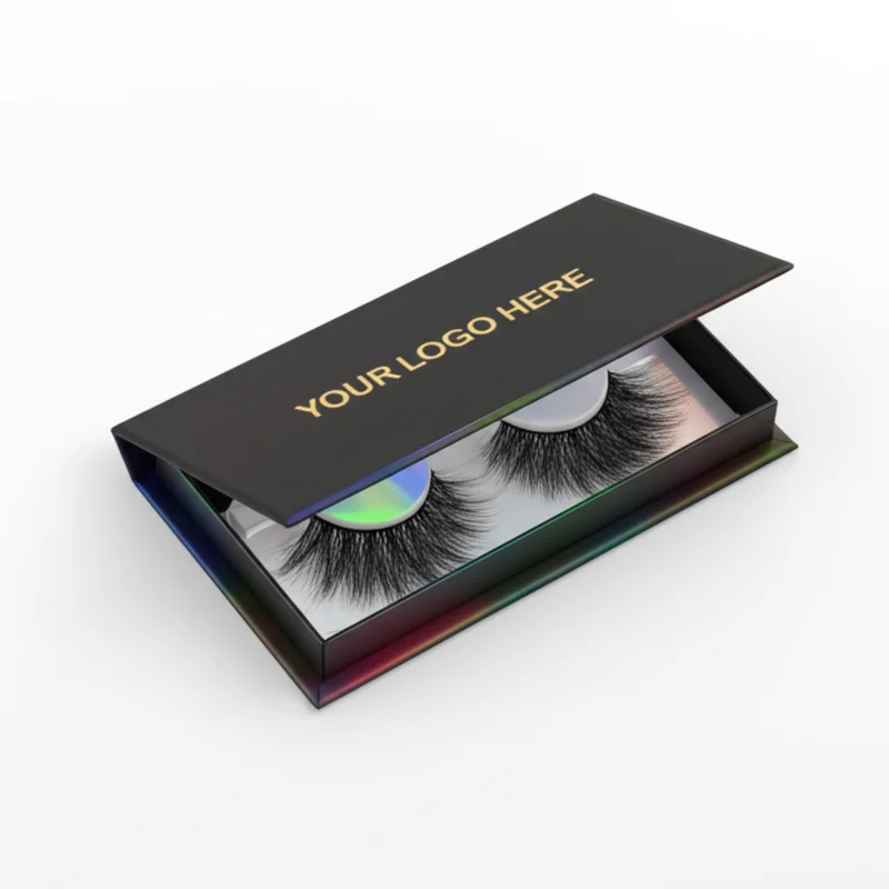 Custom branded eyelash packaging box with rigid cardboard construction and magnetic closure. Includes molded lash tray that presents lashes elegantly upon opening. Available with clear window to showcase lashes without opening or solid lid for full branding coverage. Holographic lamination option creates eye-catching iridescent effects that stand out on retail displays. The magnetic closure adds a premium unboxing experience that communicates quality.