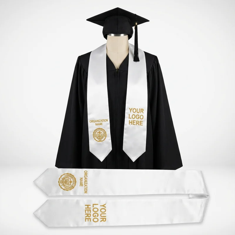 Custom printed satin graduation stole measuring 60 inches long by 4 inches wide with angled ends. The smooth satin polyester fabric drapes elegantly over graduation gowns without adding bulk. Full-color printing or embroidery on both sides accommodates logos, Greek letters, organization names, and achievement designations. Standard white, black, or colored satin base options coordinate with school colors. Heat-set printing ensures colors won't fade or transfer during ceremonies in warm weather.