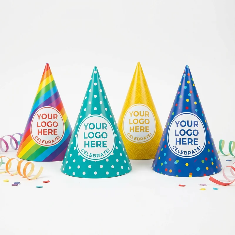Cone-shaped party hats with full-color printing and elastic chin strap. Durable cardstock construction holds shape during parties. Custom printing wraps around cone creating 360-degree branding. Elastic strap keeps hats secure during activities and dancing. Standard cone measures 7 inches tall. Bulk packaging makes large party distributions affordable.