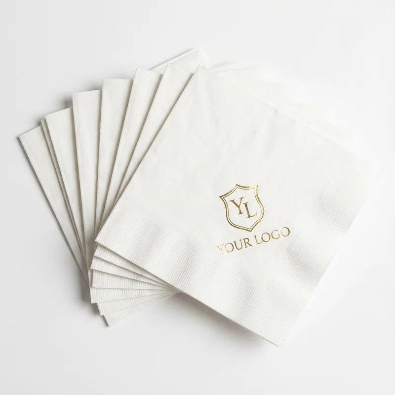 Beverage or luncheon napkins with custom printing in 2-ply or 3-ply construction. Beverage size (5x5 inches) for drinks; luncheon size (6.5x6.5 inches) for food service. Full-color or spot-color printing on one corner or covering surface. Pack of 50 napkins per unit. The multi-ply construction provides absorbency without tearing when wet.