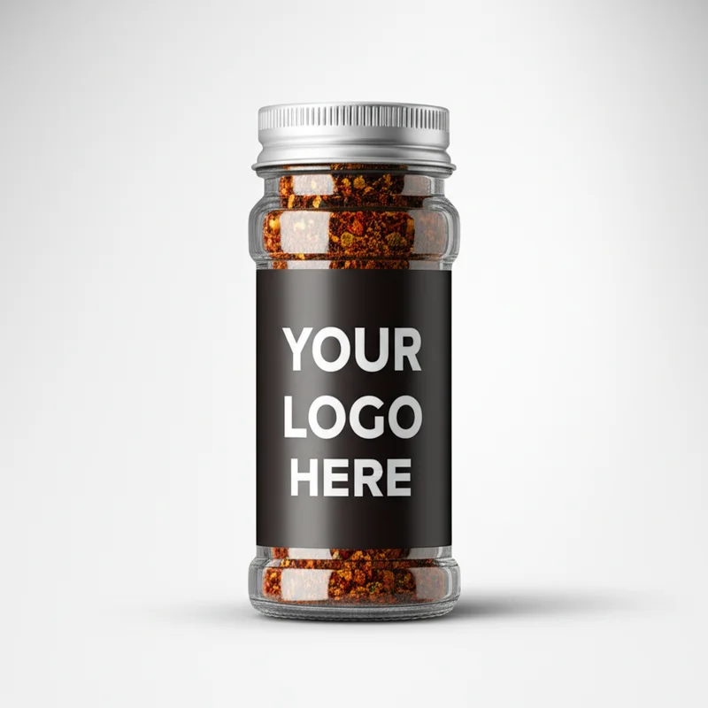 Custom branded seasoning blend jars in classic glass with dual-flap shaker lid for pouring or sprinkling. 4 oz capacity is perfect for retail-size spice jars. FDA-compliant glass and food-safe materials. Full-color vinyl labels or shrink sleeves for complete branding.