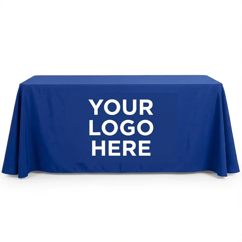 Premium custom tablecloths with your logo for restaurants, events, and corporate functions. High-quality polyester blend fabric is stain-resistant and machine washable. Full-color printing or elegant embroidery options available. Standard sizes (4ft, 6ft, 8ft) or custom dimensions. Hemmed or serged edges for professional finish. Perfect for creating a cohesive branded environment at banquets, conferences, and special events.