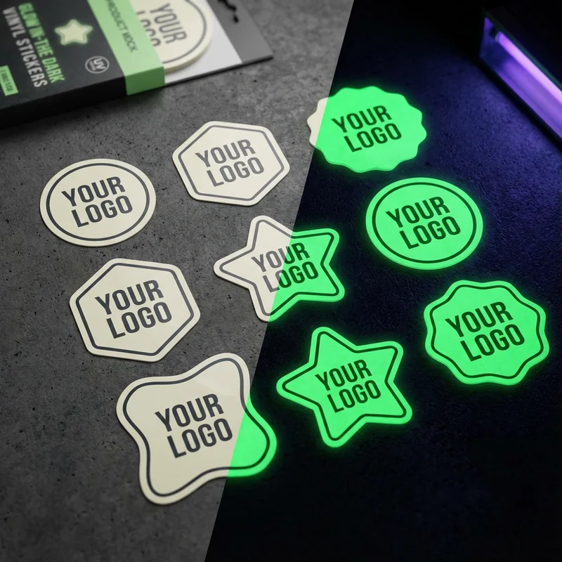 Vinyl glow-in-the-dark stickers in custom shapes with die-cut designs. Phosphorescent vinyl charges from light and glows bright green-yellow in darkness. Waterproof and weatherproof for indoor/outdoor application. Strong adhesive backs stick to laptops, water bottles, helmets, walls, and equipment. Custom die-cutting creates any shape matching logos or designs.