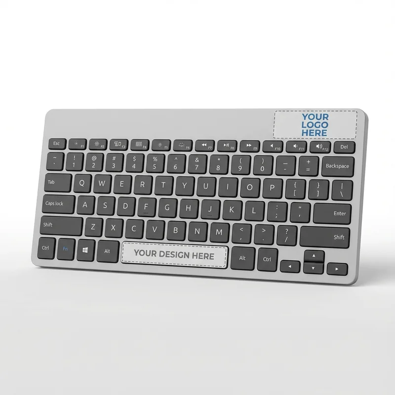 Compact Wireless Bluetooth Keyboard in three color options. This rechargeable keyboard features Bluetooth 5.1 connectivity for seamless pairing with devices. Its compact layout is designed for efficiency, making it suitable for workspaces with limited desk space. Pricing starts at $28.00 per unit with a minimum order of 25. Custom branding is available to showcase your logo, enhancing your company's presence in any professional setting. Standard turnaround time for orders is 10-14 days.