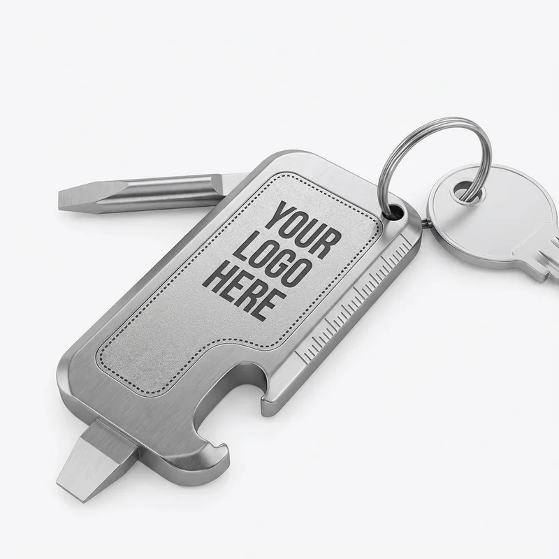 **Multi-Tool Keychain** Enhance your toolkit with this 6-in-1 Multi-Tool Keychain, crafted from durable stainless steel. This compact accessory features essential tools including a bottle opener, screwdriver, and mini knife, making it a practical addition for everyday use. Available in four colors, it offers a sleek look that can be easily customized with your logo. Priced at $4.00 per unit with a minimum order of 150, this keychain is a cost-effective option for corporate giveaways, employee gifts, or promotional events. Standard turnaround time is 10-14 days, ensuring you receive your order promptly.