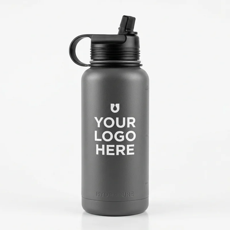 Large capacity 32oz wide-mouth water bottle in charcoal gray. Built for rugged use and high hydration, providing a large area for your custom brand logo.