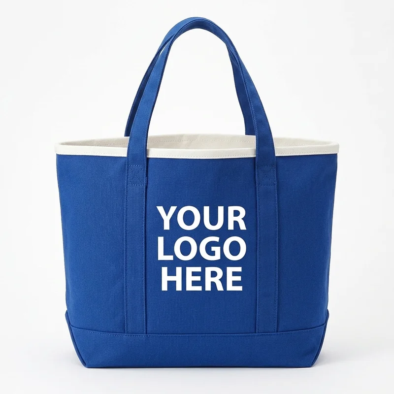 A durable and stylish 10oz navy blue cotton canvas tote bag. Features a large main compartment and high-quality construction, perfect for premium custom branding.