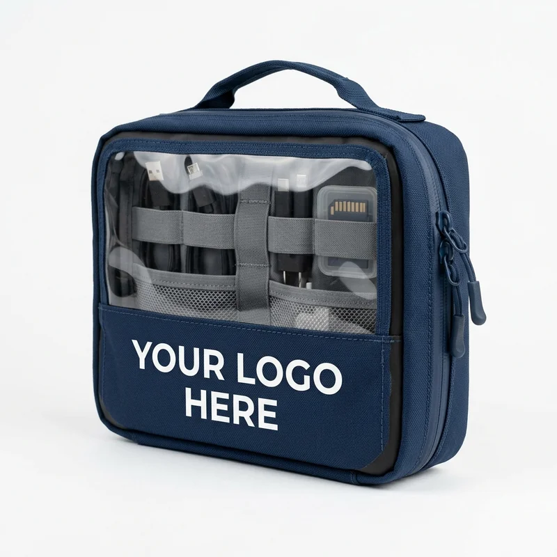 Large waterproof navy blue gear pouch for cord organization. Durable construction with a clear window, providing a clean look for your custom brand logo.