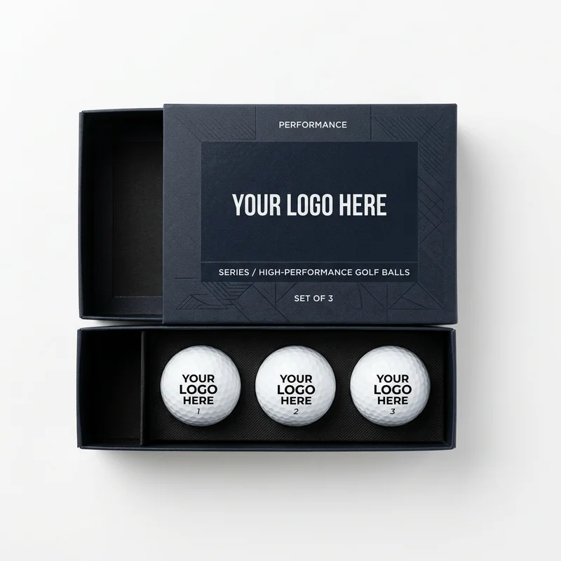Professional high-performance golf ball set in a custom branded box. Features high-quality printing on the balls, ideal for corporate events.