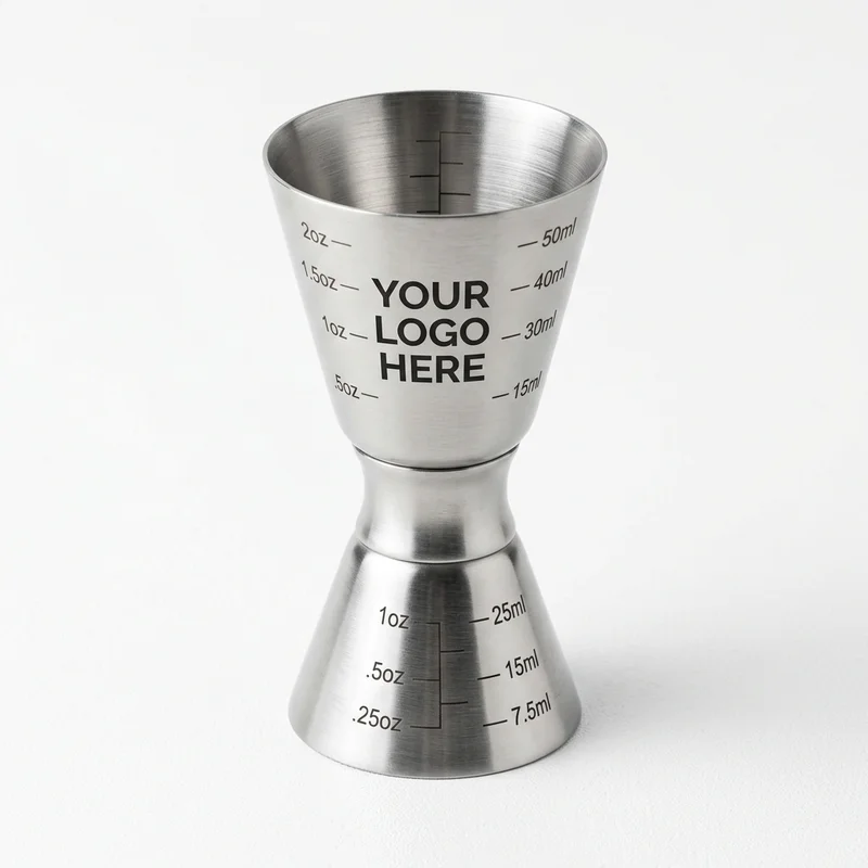 The ultimate precision tool for bartenders. This professional stainless steel jigger features clear measurement markings for accurate, high-quality custom branded service.