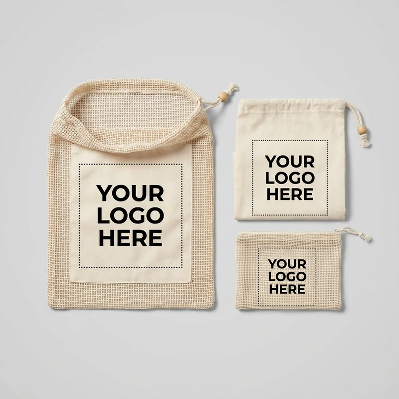 **Produce Bags Set** Material: Mesh | Quantity: 5 bags | Price: $8.00 | Minimum Order: 100 The Produce Bags Set includes five durable mesh bags designed for easy storage and transport of fruits and vegetables. Made from breathable material, these bags help maintain freshness while allowing visibility of contents. Each bag is lightweight and reusable, making them an eco-friendly alternative to single-use plastic bags. Available for bulk orders starting at $8.00 per set, these bags can be customized with your company logo, providing a practical promotional item that aligns with sustainable practices. Standard production time is 10-14 days.