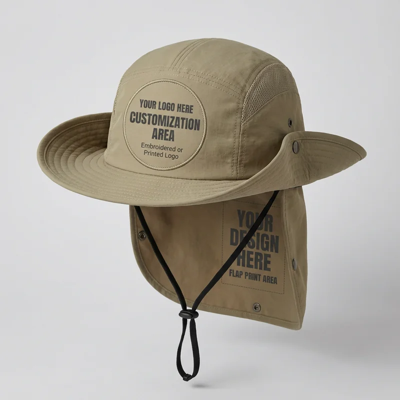 Outdoor safari-style hat with removable neck flap for maximum sun protection. Features mesh ventilation and chin strap. Ideal for outdoor workers, hiking groups, and adventure tourism.