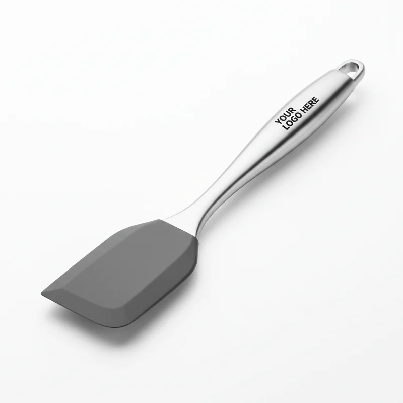 Heat-resistant silicone spatula for cooking and baking. Sturdy handle with silicone head. Food-safe up to 450°F. Practical kitchen promo item.