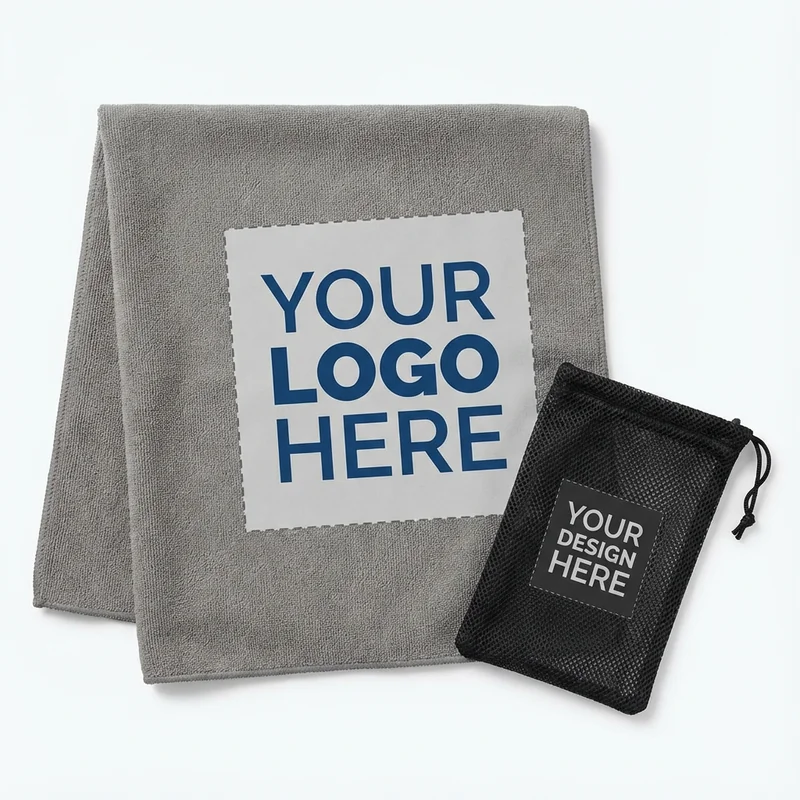 Microfiber Sports Towel designed for outdoor activities, measuring 32"x16" for ample coverage. Made from high-quality microfiber, this towel quickly absorbs moisture and dries rapidly, making it a practical accessory for sports events, gym sessions, or outdoor adventures. It comes with a convenient pouch for easy storage and transport. Available in 10 colors, this towel can be customized with your logo, making it a functional promotional item for your business. Priced at $7.00 per unit with a minimum order of 100, it offers bulk pricing options to suit your budget. Standard production time is 10-14 days.