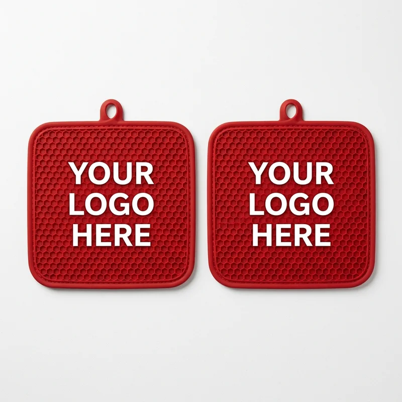 Practical heat protection for your kitchen. This set of 2 red silicone pot holders is durable and perfect for high-quality custom brand logo printing.