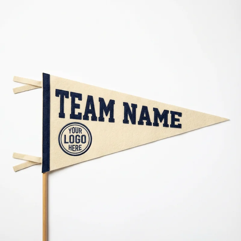 Felt pennant flag measuring 12x30 inches with sewn letters or screen printing. Traditional triangular pennant shape creates classic sports decoration. Durable felt construction in school and team colors. Sewn-on felt letters create dimensional team names and mascots. Screen printing option enables full-color logos and graphics. Includes string for hanging on walls, dorm rooms, or tailgate areas.