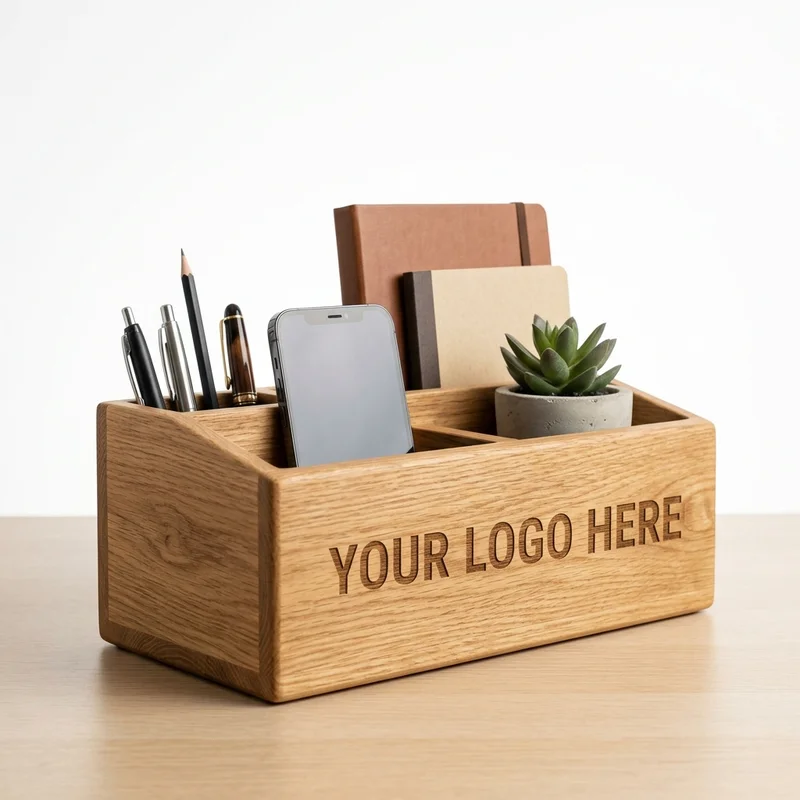 Wooden or metal monitor stand that raises screens 4 inches to ergonomic eye level. Supports monitors up to 32 inches and 44 pounds. The space underneath holds a keyboard, notebook, or office supplies when the monitor is in use. Non-slip padding protects the monitor base, and a cable management cutout in the back keeps wires tidy. Corporate IT departments and home office setups order these for workplace wellness. The elevation reduces neck and eye strain during long computer sessions, which matters a lot for remote workers. More substantial than a basic laptop stand since it handles desktop monitor weight. The under-monitor storage reclaims desk space you didn't know you had. Works alongside desk organizers, keyboard wrist rests, and desk lamps for a full ergonomic workstation. Laser engraving or screen printing on the front panel adds corporate branding. A popular item for employee appreciation gifts promoting workplace wellness.