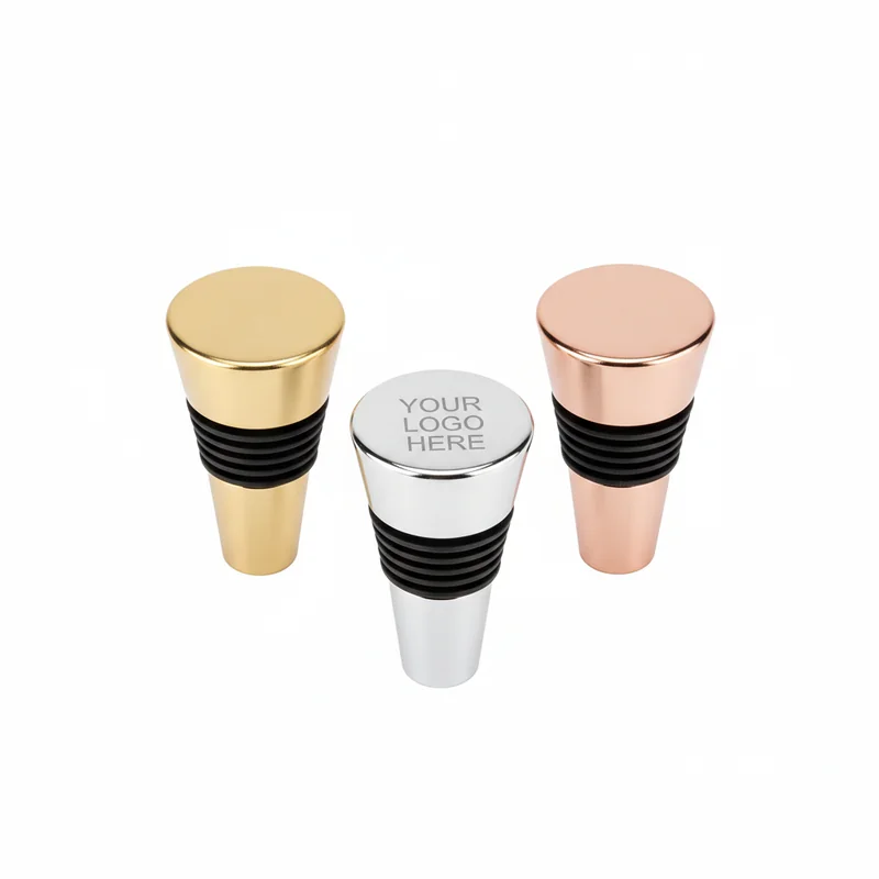 Wine bottle stoppers with a metal top and silicone seal. The metal disc top has a large customization area for engraving or printing. The silicone creates an airtight seal that actually preserves wine freshness. They come in gift-ready packaging and look more upscale than most promo items.